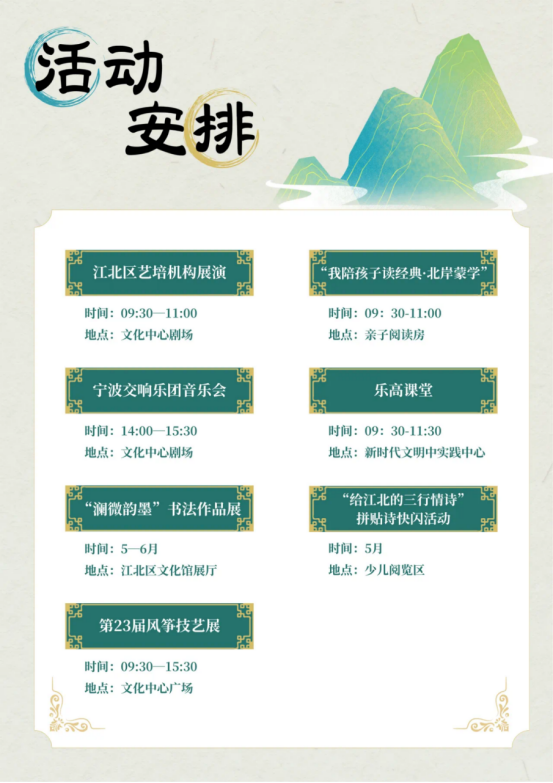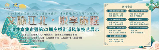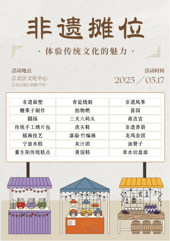 今天,距“5·19中国旅游日”全国主会场活动启动仅剩3天,“嗨在宁波—江北非遗日”如约而至。承载着人文底蕴与多元体验的“文脉江北・悦享旅程”主题活动将于5月17日在江北区姚江北岸(江北区文化中心)盛大启幕,邀您共赴一场沉浸艺术展演、品味非遗魅力的江北之旅。