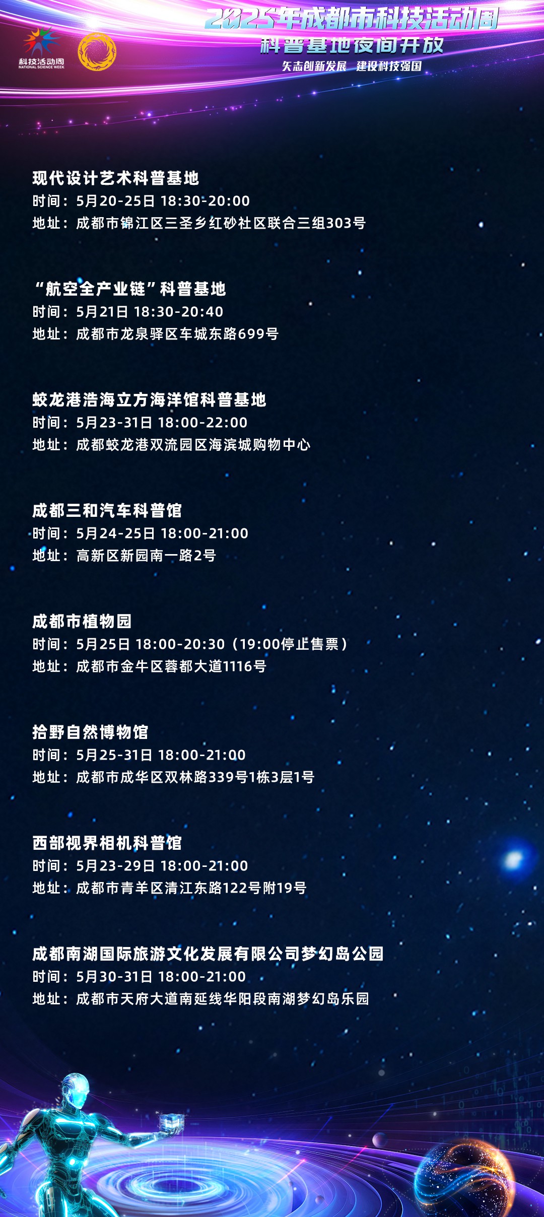 5月23日晚,四川省、成都市将共同举办2025年四川省科技活动周暨蓉城科学之夜启动仪式,通过致敬科技工作者、科学实验展演、主题展览互动体验等线上线下结合的形式,展现科技工作者的探索精神,展示2024年四川省及成都市重大科技成果,面向全市营造科普惠民的浓厚氛围。