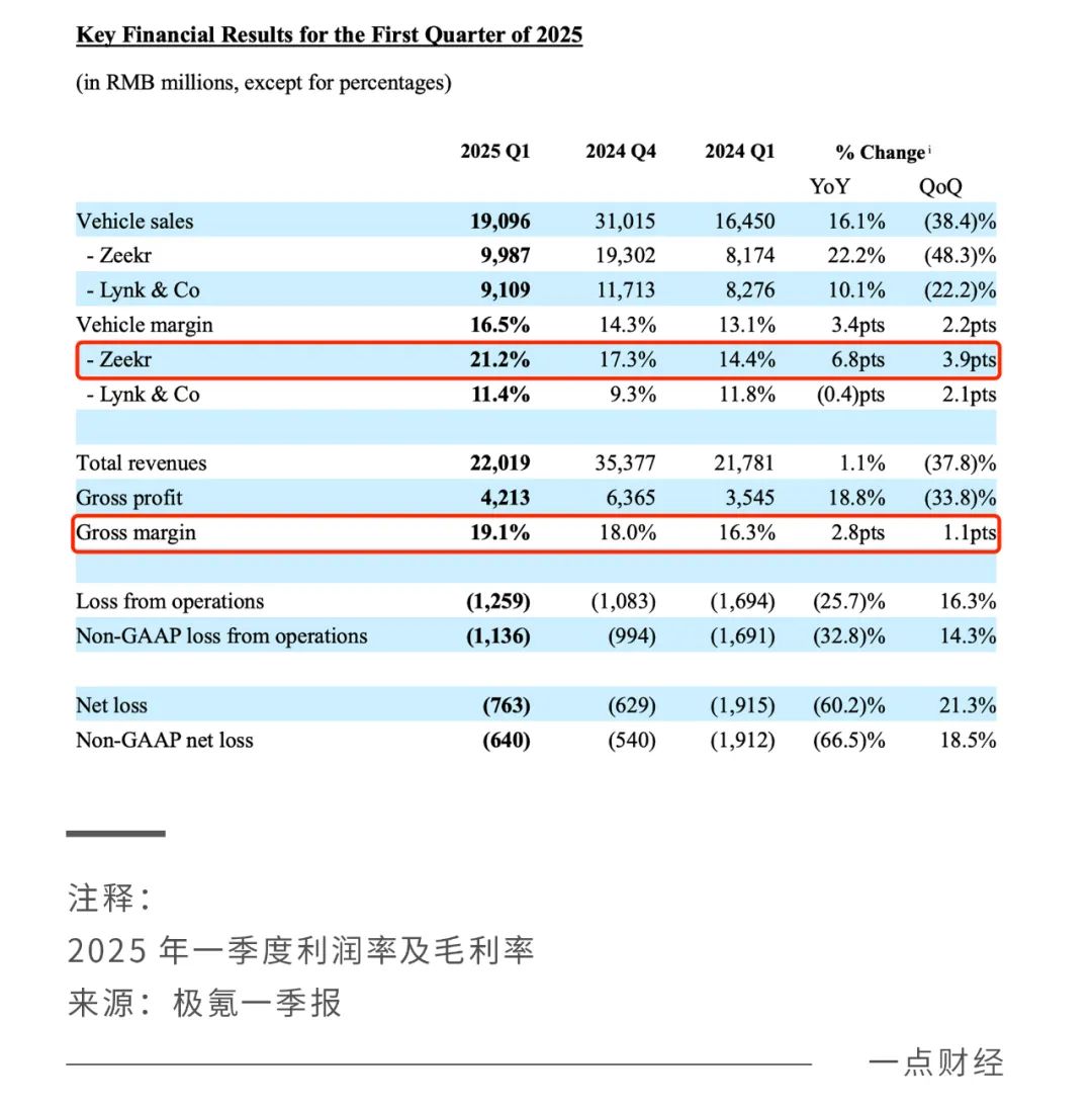 根据5月15日极氪科技发布的2025年一季度财报,这个故事似乎正在如预期那样上演。数据显示,极氪科技净亏损收窄60%,双品牌整车毛利率16.5%,综合毛利率攀升至19.1%,创历史最高。其中,极氪品牌的利润率更是攀升至21.2%。