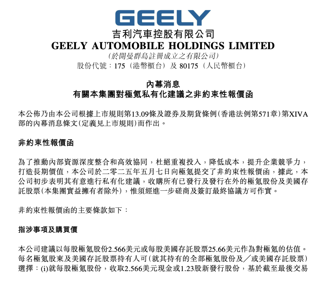在美股一年游,极氪的小股东们赚没赚钱不知道,但事务所和中介们一定大赚特赚。不过这次私有化,吉利也给出了比较具有吸引力的方案:以25.66 美元收购,小股东们可以选择收现金,或者换股吉利的股票。