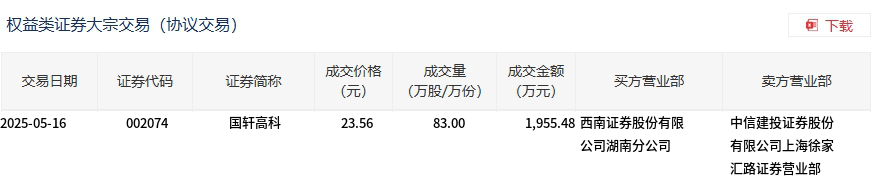 5月16日,国轩高科大宗交易成交83万股,成交额1955.48万元,占当日总成交额的1.76%,成交价23.56元,较市场收盘价23.1元溢价1.99%。