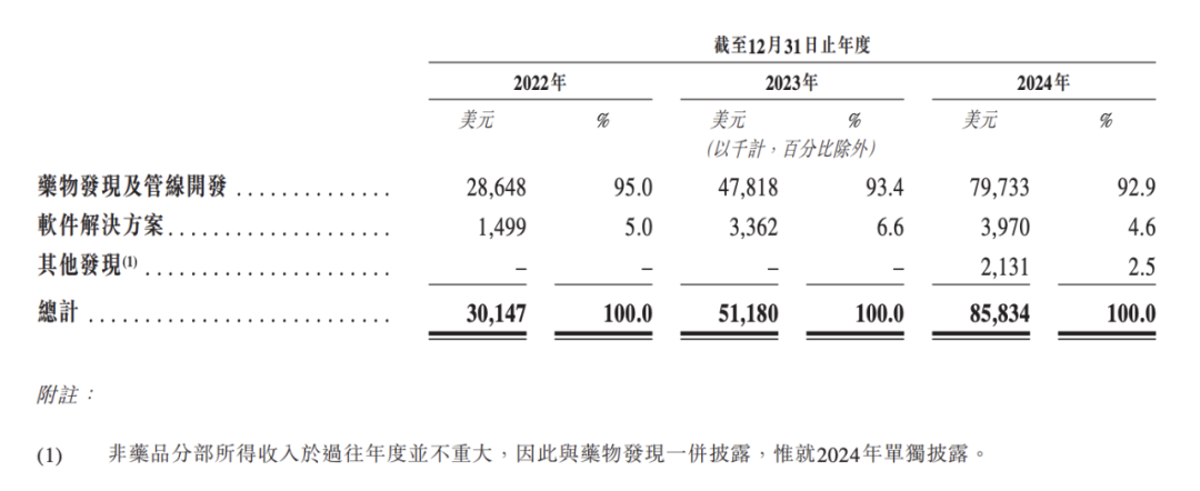 根据最新招股书,目前英矽智能的收入结构展现出高度依赖药物发现及管线开发的特点,2022年至2024年该业务贡献收入占总收入的95%、93.4%,以及92.9%。