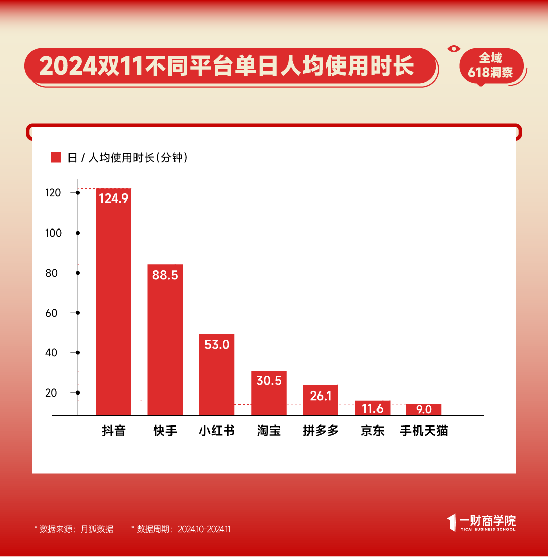 但是随着内容平台的崛起,互联网的流量格局再次被重新划分。月狐数据显示,2024年双11期间,淘宝、京东、拼多多等货架平台,单日人均使用时长均不足31分钟,但同期抖音、快手和小红书的人均使用时长分别为,125分钟、89分钟和53分钟,尤其是当这些占据用户大量时长的内容平台开始做电商闭环。