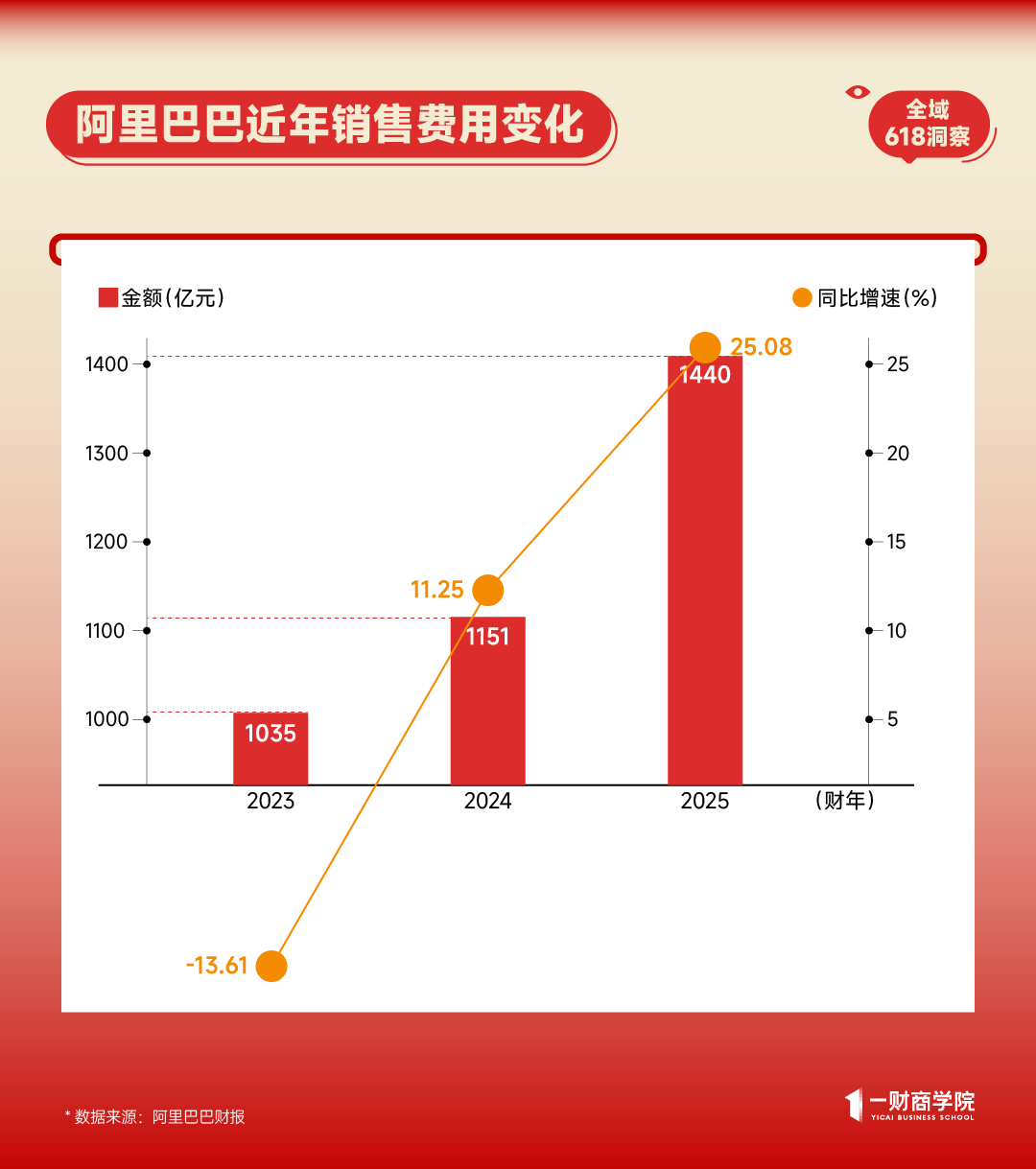 对应的,2023财年和2024财年,阿里的销售费用同比增速分别为-13.61%和11.25%,但2025财年销售费用增速则达到了25.08%。