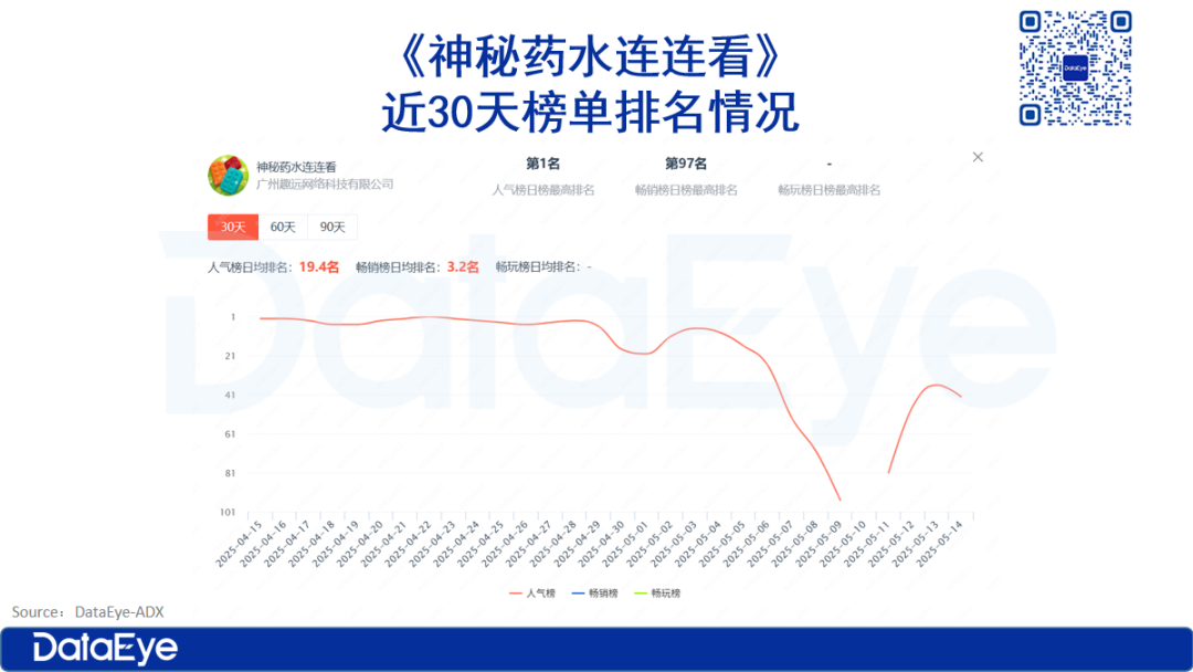 在国内小游戏领域,DataEye-ADX数据显示:近30天以来,《神秘药水连连看》多次登上微信小游戏人气榜,4月22日,登顶人气榜。该游戏的主投厂商为:广州趣远网络。