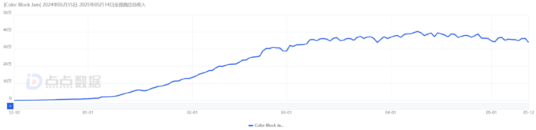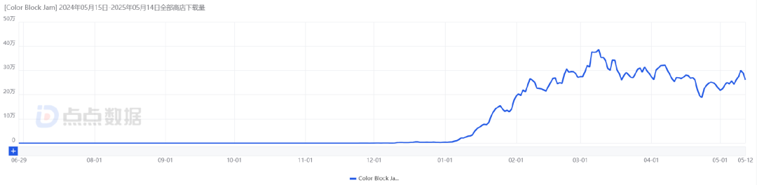 再来看海外市场,《Color Block Jam》在全球多个主要市场上线,点点数据显示截至5月12日,双端全球下载量突破2995万,双端收入超过2.5亿元。且在美、日、英、德等多个T1市场表现突出。