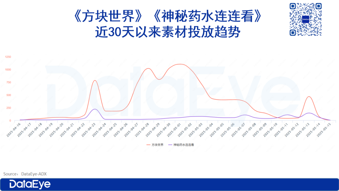 《方块世界》投放在四月呈现出波动上升的趋势,进入五月后,投放量总体呈回落趋势。其中,66%左右为视频素材,图片素材中,多为游戏截图素材。