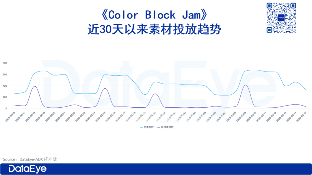 再来看《Color Block Jam》从去年底开始实现大规模投放,不断加大投放力度,去重后累计投放素材数达18.4万。与其他游戏在投放规律相对不同的是,《Color Block Jam》平均大约每7日为1次素材投放峰值,每个投放低谷周期持续2—3日,并周而复始地进行。