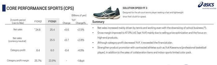 核心运动部门未来的重点会是由品牌代言人德约科维奇领衔的网球品类。亚瑟士在业绩报告中对核心运动部门业绩进行拆解时将网球鞋solution speed ff3列为明星产品,并指出该部门的销售额增长主要由网球产品的优异表现驱动。