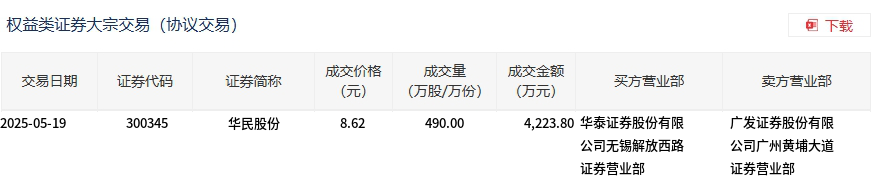 5月19日,华民股份大宗交易成交490万股,成交额4223.8万元,占当日总成交额的17.11%,成交价8.62元,较市场收盘价8.62元持平。