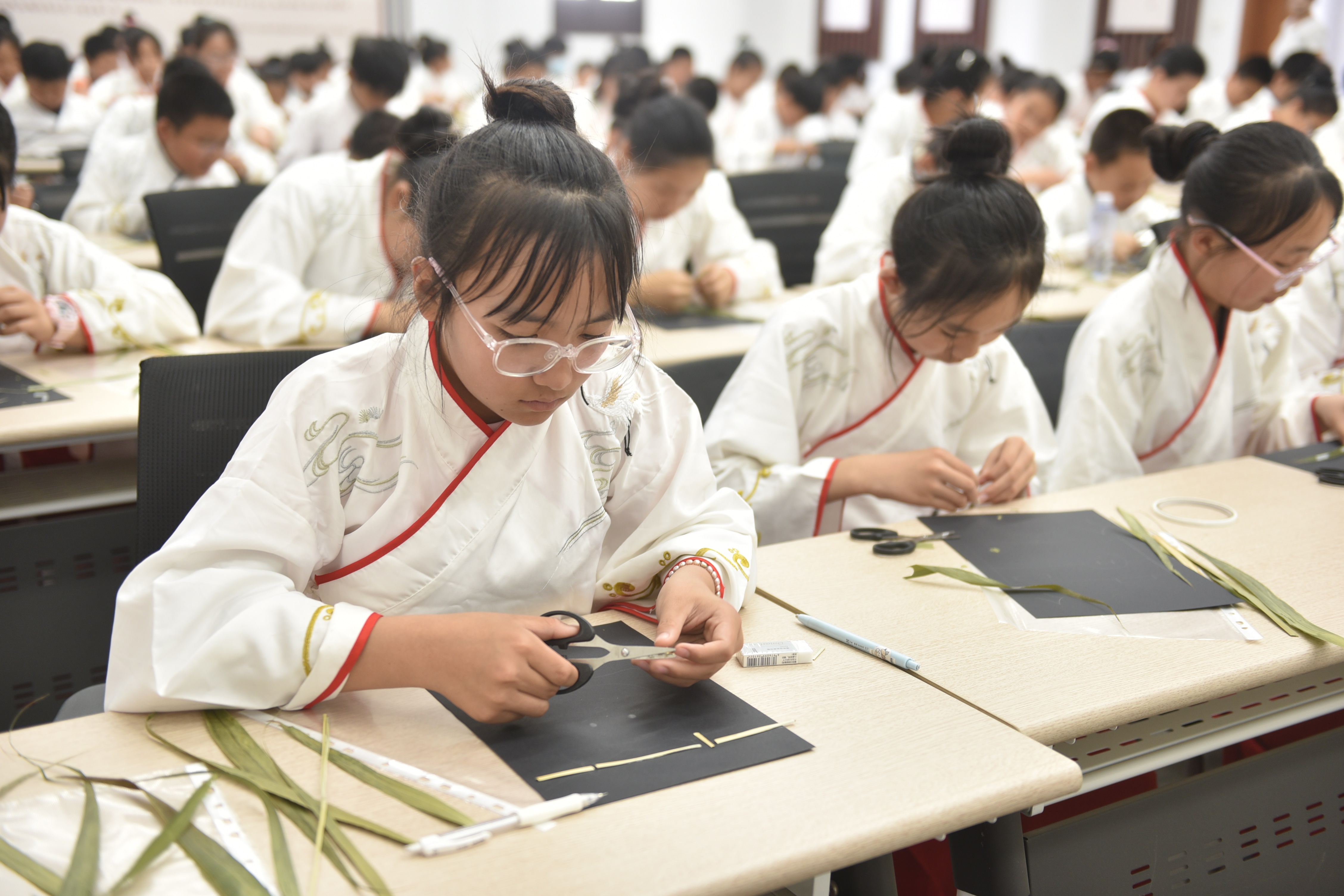 研学过程中,200余名小学生走进广川学宫内的董子文化展览馆,在讲解员的讲解下,深入了解董仲舒的生平事迹,通过参加董子儒学文化课程学习,与老师一起探究董仲舒的儒学思想精髓。随后,学生们在手工艺人的指导下,动手制作芦苇画,领略非遗文化的魅力。