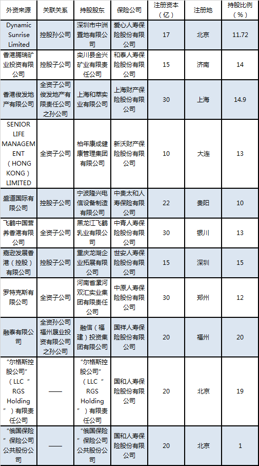 今年以来共有11家外资发起设立保险公司。其中香港资本最积极,共有6家香港资本参与了本轮保险牌照抢夺战。香港资本大多数是通过控股/全资的内陆子公司参与内陆险企的设立,包括香港腾瑞矿业投资有限公司、SENIOR LIFE MANAGEMENT(HONG KONG)LIMITED、飞鹤中国营养香港有限公司、嘉逊发展香港(控股)有限公司和罗特克斯有限公司在内的6家港资均是如此。