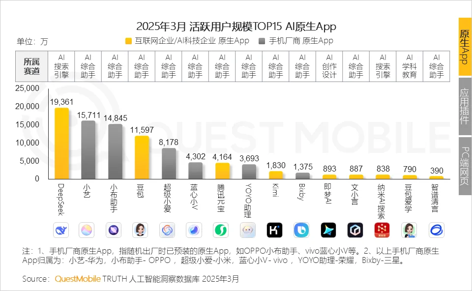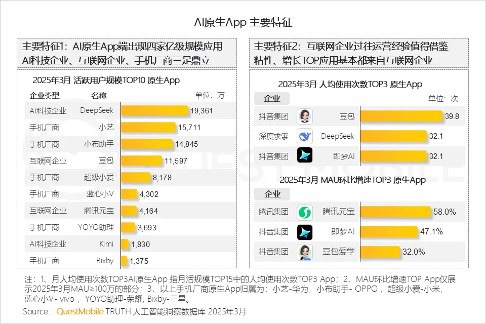 QuestMobile发布的《 2025全域AI应用市场报告》指出,目前市场中的AI应用在原生App端已出现四个亿级规模产品,分别对应三类企业:以DeepSeek为代表的AI科技企业,华为小艺、OPPO小布助手为代表的手机厂商,以及豆包为代表的互联网企业。