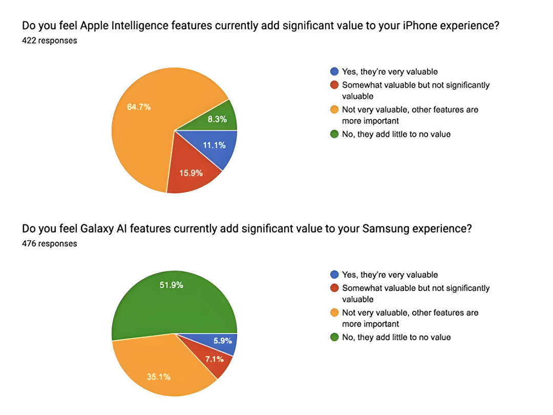 国外知名二手交易平台SellCell的调研显示,高达73%的Apple Intelligence用户和87%的三星Galaxy AI用户认为,这些AI功能并没有给他们带来太多价值,甚至有些人觉得几乎没有增加任何价值。