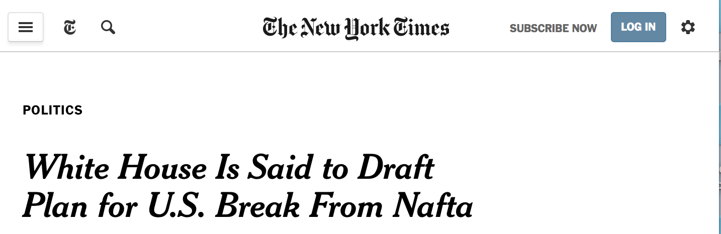 北美自由贸易协定于1994年生效,大大降低或取消了北美三国间大量商品交易的关税。最近,白宫宣布对加拿大木材征税,并宣称加拿大对美国乳制品实施不公平待遇。