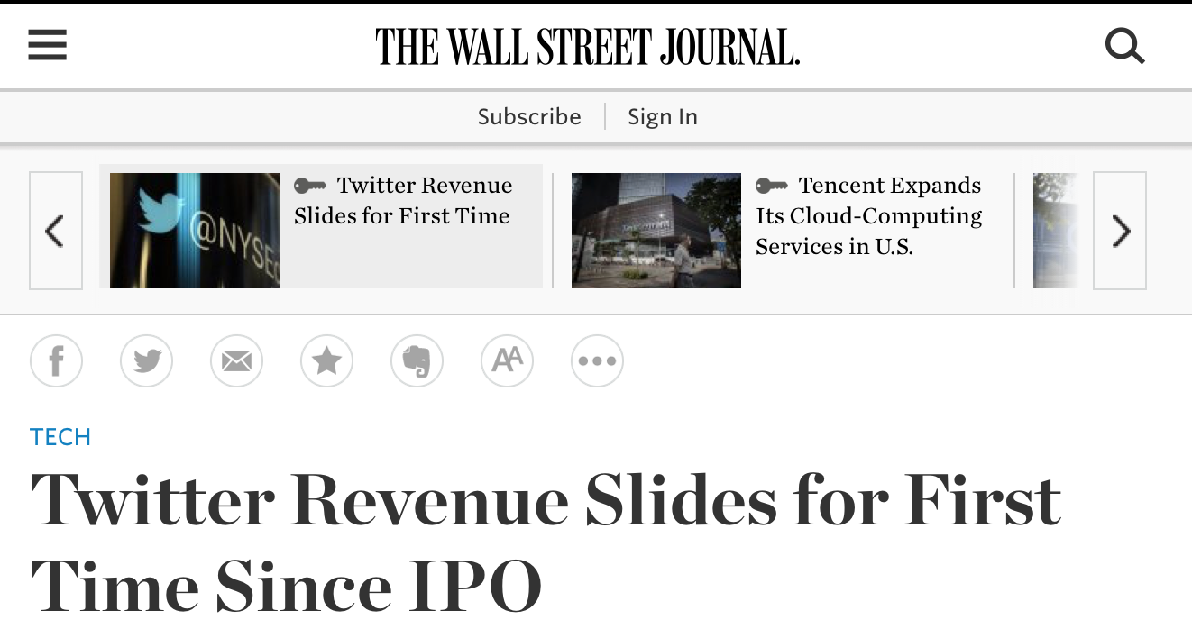 【推特发布一季度财报 利润首次下降】社交网络推特(Twitter Inc.)周三发布了一季度财报,盈利下降8%至5.5亿美元。这是推特自上市以来首次利润下降。