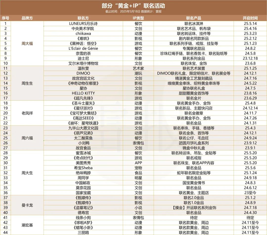 依托黄金行业财报中透露出的趋势,雷报不完全统计了目前在“黄金谷子”赛道布局较多的黄金珠宝品牌,及部分具体的IP联名情况(人工统计存在误差):