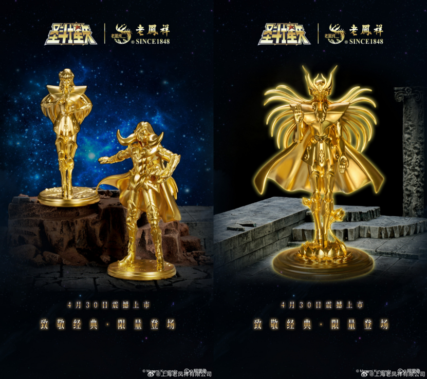 这样的背景下,IP联名成为破局关键。例如,周大福与Chiikawa联名转运珠,发售当日脱销,迪士尼系列累计销量超200万件;五一期间,老凤祥与《圣斗士星矢》推出联名产品,上市短短两周,系列产品已创下近亿元销售,其中最受关注的666克黄金手办售价88万元,限量30件被抢购一空,黄牛市场的手办单件溢价更是攀至百万级。