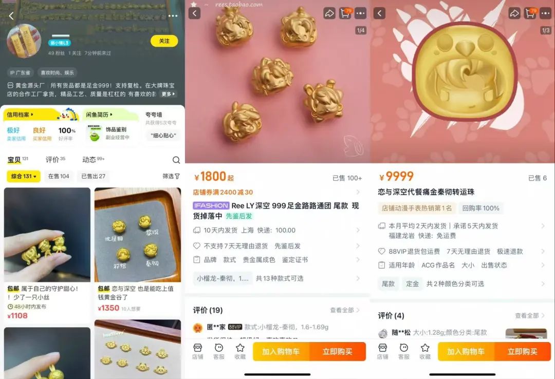 除了大牌金店“大玩联名”外,打金实体店和水贝商家也迎来新的机遇。以乙游IP玩家为首,“痛金”的概念开始流行,这一说法与“痛包”“痛车”等类似,即通过将IP属性附加到可供展示的随身物品及设备上,来满足年轻人的收藏和社交需求。这类趋势催生了“定制痛金”的广阔市场。