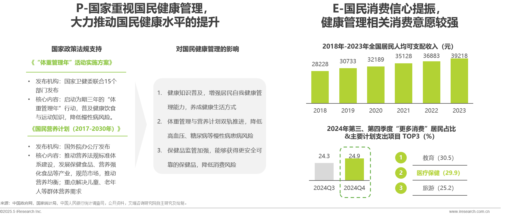 政策方面,国家卫健委联合15部门启动三年“体重管理年”行动,协同国务院《国民营养计划》构建全人群健康管理体系,通过标准化保健食品监管与营养知识普及,推动国民健康生活方式的养成,和慢性病防控能力的提升,从而全面提升国民的健康水平。经济方面,统计数据显示我国居民收入保持稳定增长态势,2024年四季度消费信心指数显著回升。其中,医疗支出是居民的重要消费方面,仅次于教育。这也印证我国居民健康意识强化正重塑消费结构,是催化健康管理产业发展的核心动能。