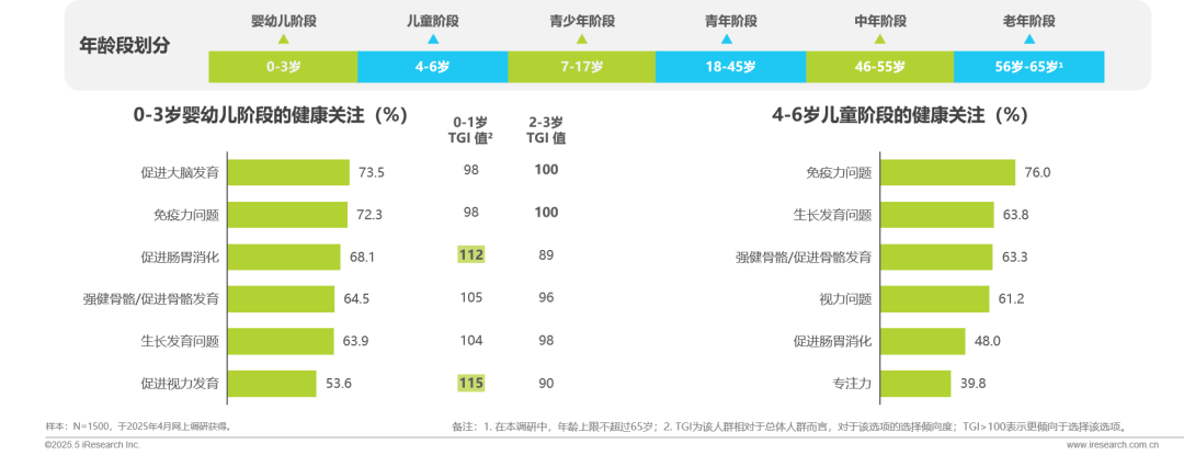 基于全生命周期健康管理视角,我国居民健康需求呈现显著年龄谱特征。其中,0-1岁婴幼儿以基础机能构建为核心,聚焦肠道菌群平衡和视力发育;2-3岁婴幼儿转向高阶发展需求,更关注大脑神经发育和免疫屏障建立。对于4-6岁的儿童来说,他们的家长仍关注孩子的免疫力问题,同时更关注生长发育、骨骼和视力健康。