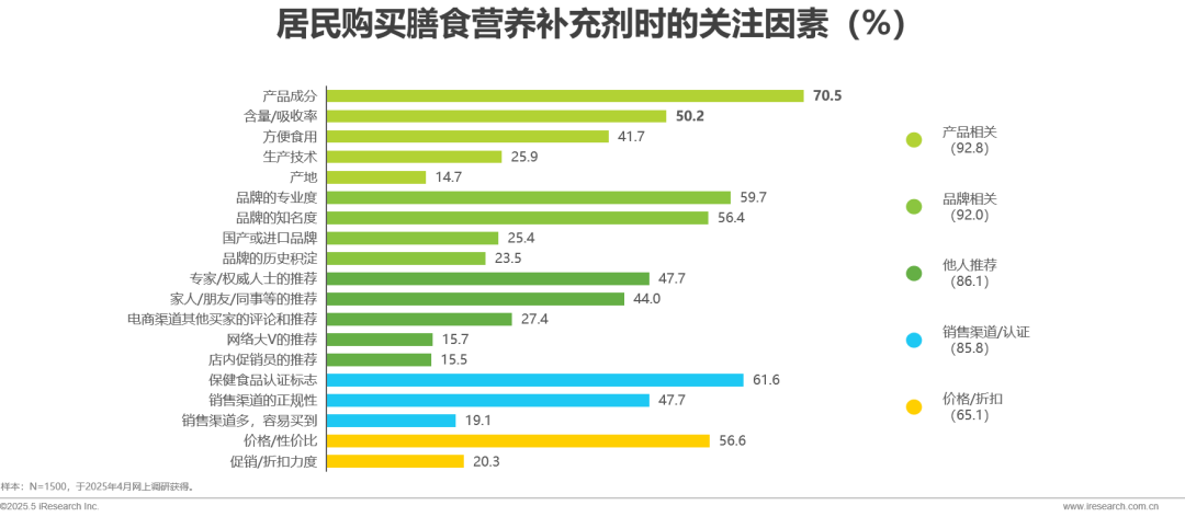 消费者在购买膳食营养补充剂时,关注因素主要集中在产品本身、品牌影响力、他人推荐、销售渠道与认证、价格与折扣等五大方面。其中,产品相关因素尤为关键,尤其是产品成分、有效含量/吸收率,是影响消费者决策的首要考量。