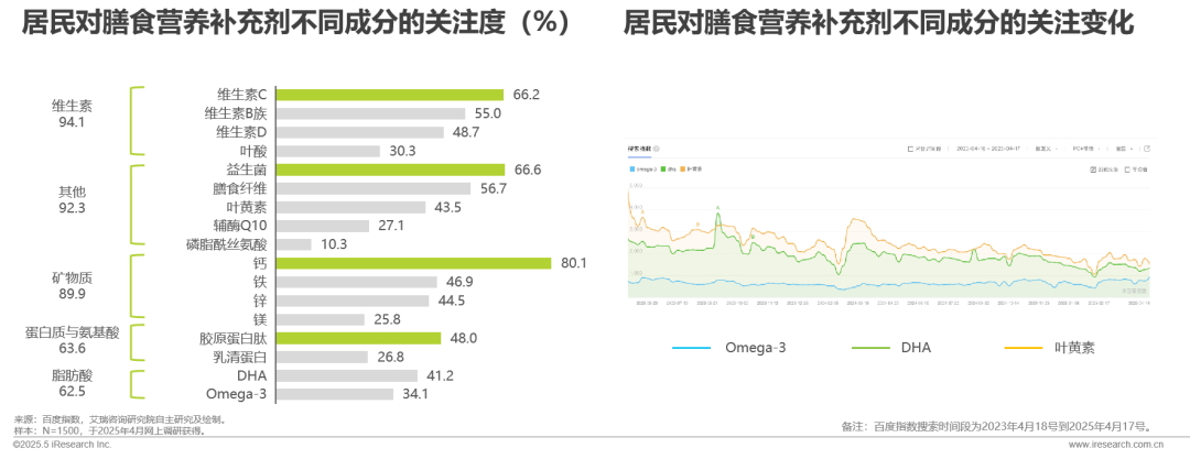 居民对膳食营养补充剂不同成分的关注度和变化