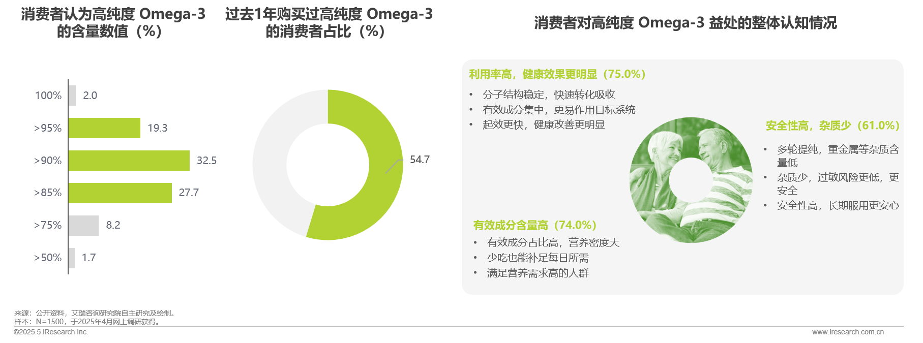 消费者认为高纯度 Omega-3 含量数值至少需达到85%,他们对高纯度 Omega-3 的健康价值认知清晰
