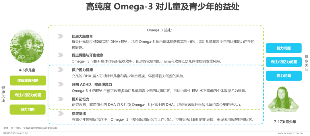 对于4–6岁儿童,家长主要关注其生长发育、专注力/记忆力及视力问题;而在青少年阶段,视力健康、注意力/记忆力和情绪状态则成为关注重点。Omega 3 在促进大脑发育、强健骨骼与牙齿、保护视力、提升专注与记忆力、调节情绪等方面的多重益处,恰好对儿童与青少年的关键健康问题提供有效支持。
