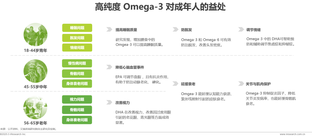 调研发现,青年人群在睡眠障碍、脱发困扰和情绪管理方面的问题日益突出;而中老年人则更关注慢性病防控、视力退化、骨骼健康及延缓衰老等问题。Omega-3 脂肪酸凭借其在改善睡眠、缓解情绪、预防脱发、保护心脑血管、维护视力、延缓衰老以及支持关节与肌肉健康等方面的积极作用,有望成为覆盖不同年龄阶段成人健康需求的重要营养支持。