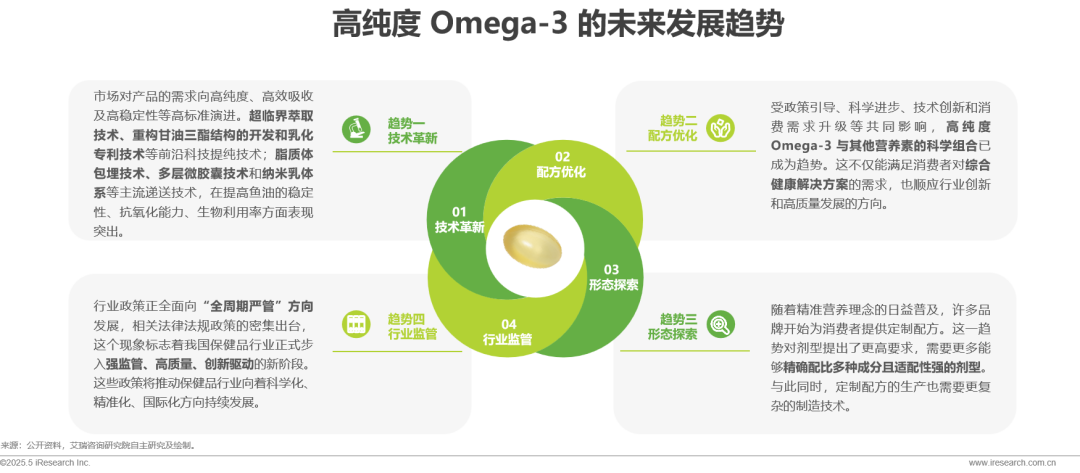 随着我国居民健康管理需求的提升和监管体系的完善,高纯度 Omega-3 行业在技术、配方、剂型及政策层面迎来全面升级。合成生物学、纳米递送技术等在纯度和吸收率上取得突破;消费者对精准营养以及场景化剂型的需求推动行业配方和剂型革新;政策法规全周期监管以及标准升级促进行业高质量发展。