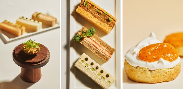“ The Georgian 餐厅:上海限时快闪 ”下午茶菜单 —— 从左至右:龙虾苹果罗勒塔、上海风味鸭肉三明治、司康与杏子桂花果酱