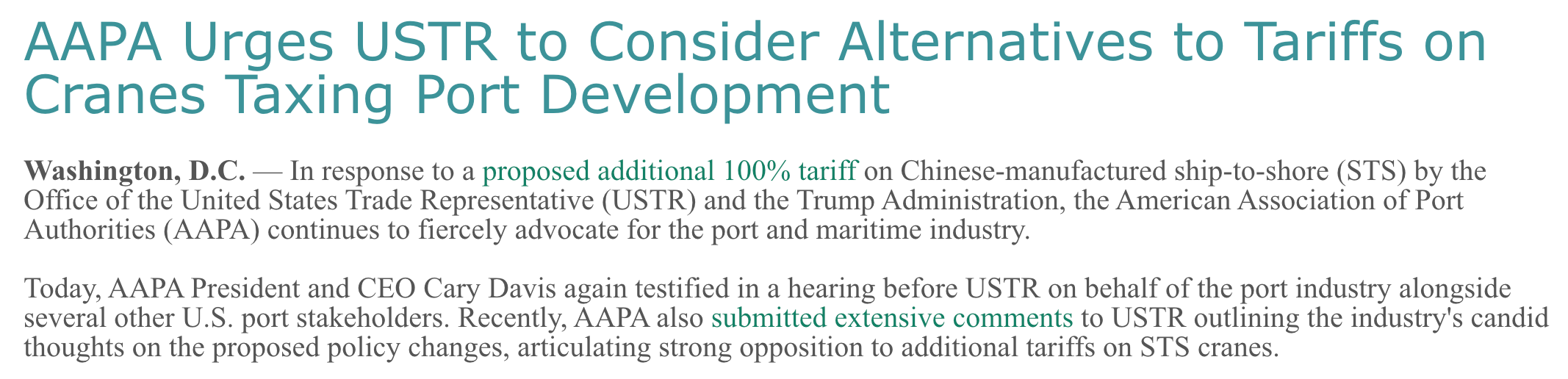 AAPA表示,加征关税不会凭空创造出美国国内的起重机制造业,只会增加公共港务局的成本。该协会称,加征关税将推高运输成本、增加港口开支,并最终增加美国消费者面临的价格压力。