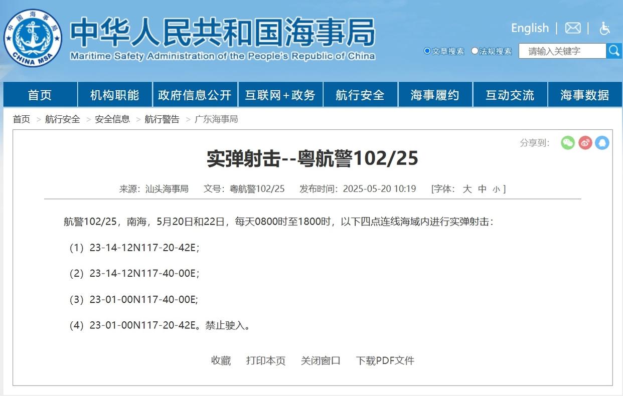 据中国海事局网站消息,汕头海事局发布航行警告,5月20日和22日,每天8时至18时,南海部分海域进行实弹射击,禁止驶入。