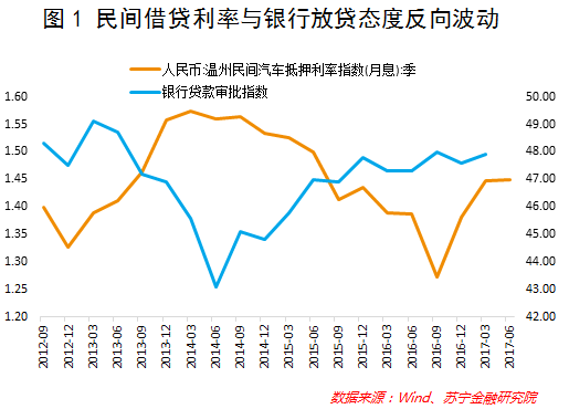 当银行惜贷时,企业的贷款需求得不到满足,转而进行民间借贷,民间贷款利率势必水涨船高;反之,当银行愿意发放贷款时,民间借贷需求下降,民间贷款利率倾向于下滑。换句话说,民间借贷利率与银行放贷态度是反向波动关系(参见图1)。