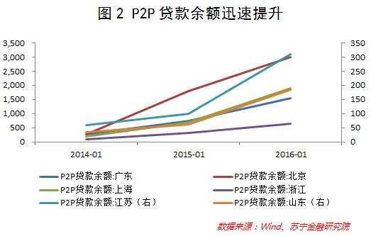 同时,民间借贷的方式也变的多样化。在传统的小贷公司等渠道以外,个体户和居民也可以通过网络借贷(P2P)来满足自己的贷款需求。自2014年至今,P2P贷款余额大幅增加,尤其以北上广一线城市最为明显。以上海为例,2014年全年贷款余额仅有189.67亿元,至2016年迅速增至1900.48亿元,翻了十倍。