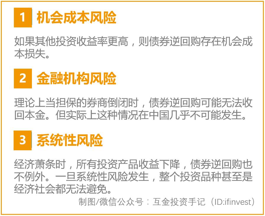 但理论上,国债逆回购也存在风险,主要来自机会成本风险、金融机构风险、系统性风险。这些风险实际发生的可能性很小。