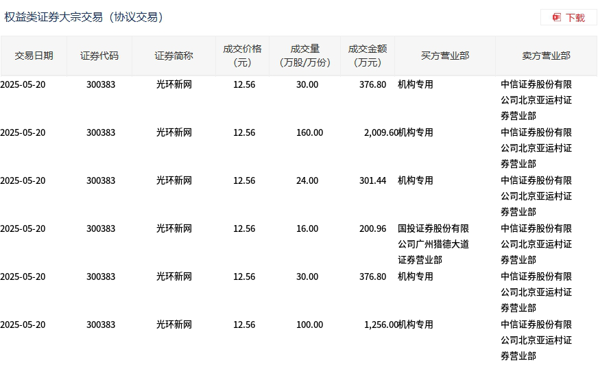 5月20日,光环新网大宗交易成交360万股,成交额4521.6万元,占当日总成交额的8.37%,成交价12.56元,较市场收盘价14.04元折价10.54%。
