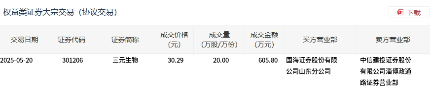 三元生物今日大宗交易折价成交20万股,成交额605.8万元