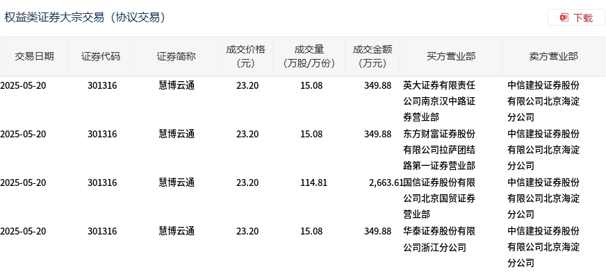5月20日,慧博云通大宗交易成交160.05万股,成交额3713.25万元,占当日总成交额的40.85%,成交价23.2元,较市场收盘价34.8元折价33.33%。