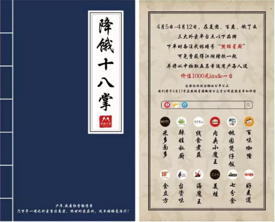 比如说,活动可以采取暗号抽奖的形式,并且给单页设置一个主题。下面这种“武林秘籍”就是其中一种呈现方式,活动名“降饿十八掌”对应“武林秘籍”的主题。这种创新、有趣的单页,更容易被上班族接受。