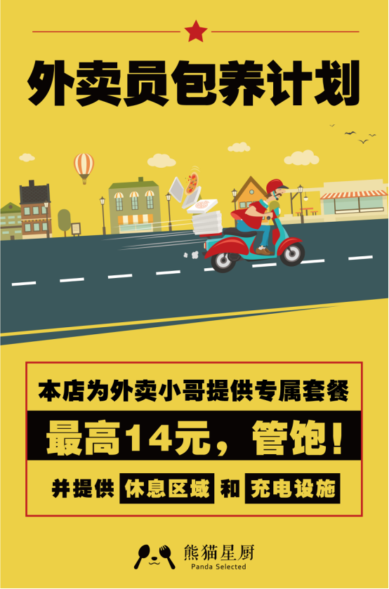 去年冬季,熊猫星厨发掘出了一个独特的用餐场景:外卖送餐员在午餐外卖高峰后的休息时间,面临就餐困难、缺少休息场所等问题。针对这个特殊的用餐场景,他们开启了“外卖员包养计划”,在有堂食用餐区域的共享厨房内,为外卖员提供“14元管饱餐” 、“休息区域”和“充电设施”等。