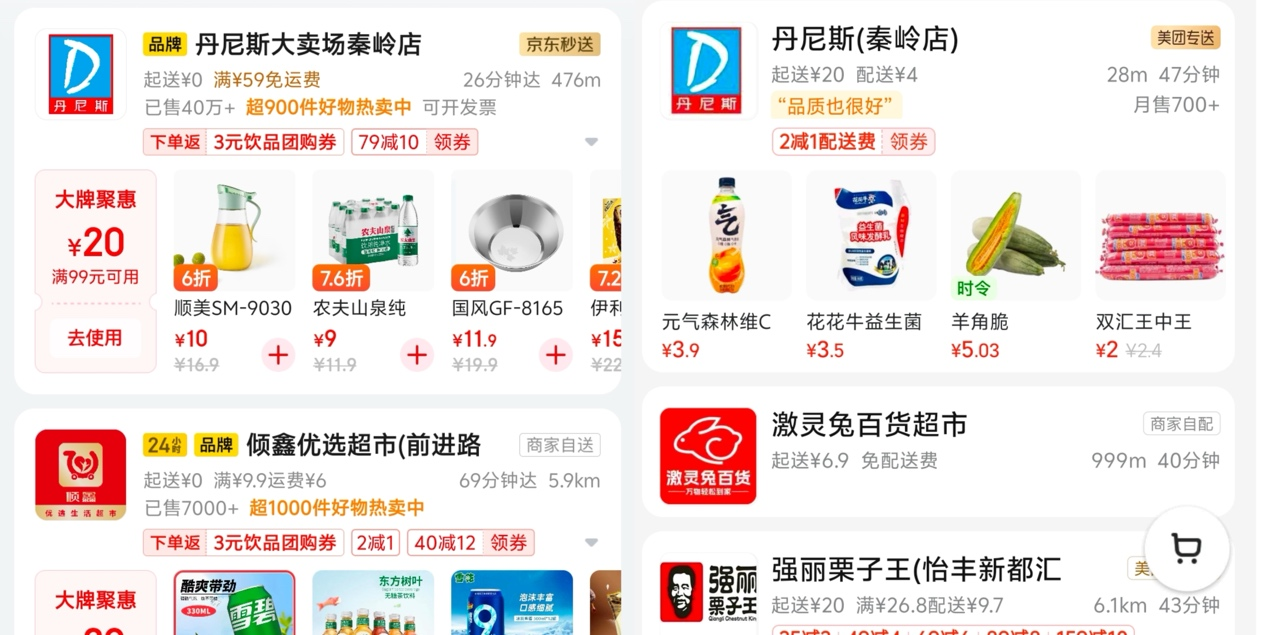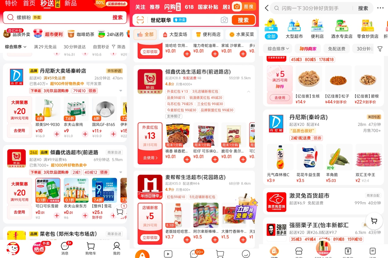 比如以郑州本地的综合商超“丹尼斯”为例,《财经故事荟》在5月17日选择同一门店后发现,除不同的品类券外,京东秒送有“满79减10、满99减12”的优惠券,但美团闪购只有“满2减1”的配送券。