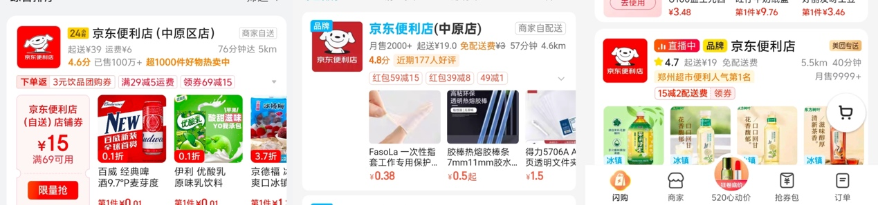 以5月17日郑州市中原区某小区为例,《财经故事荟》发现淘宝闪购的优惠券力度最大,除了“满15减13“的外卖红包,还有“满29减5、满59减5”的店铺红包;美团闪购和京东秒送次之,前者当天有“满25减5“的神券,后者有”满99减20“的大牌券和”满3减2“的百补券。