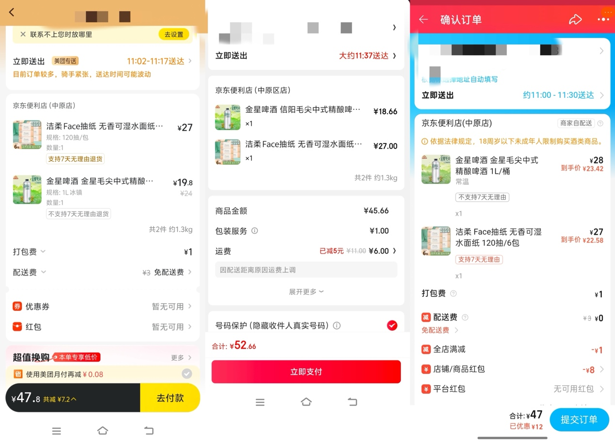 整体的感受是,淘宝和京东更优惠,美团闪购速度更稳定。