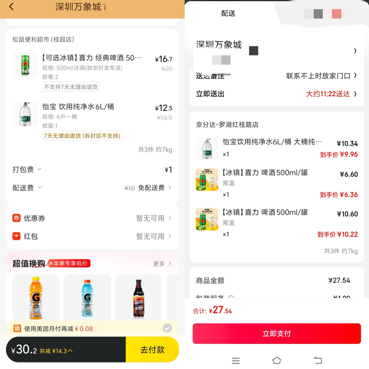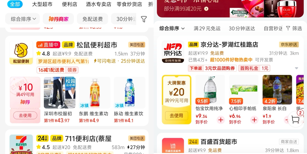 以深圳为例,《财经故事荟》以“深圳万象城”为定位,在京东秒送上的“京分达-罗湖桂红路店”显示预计配送时长31分钟,当天还有“满59减5”的全店券;而美团闪购的“松鼠便利超市桂园店”显示预计配送时长37分钟(闪电送25分钟达),当天有“满49减10”的神券。