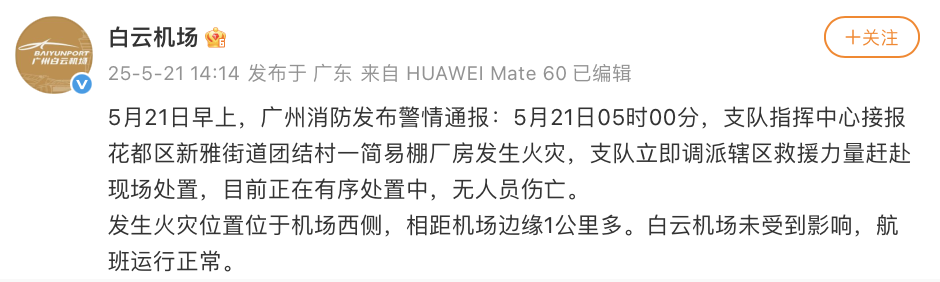 5月21日,@白云机场 发文称,发生火灾位置位于机场西侧,相距机场边缘1公里多。白云机场未受到影响,航班运行正常。