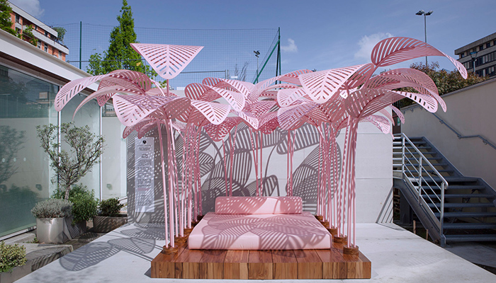 这张床不由得让人想起烈日炎炎下,在热带海边的椰林中乘凉的感觉。巴黎设计师 Marc Ange 在这一作品中,使用了可以遮阳的粉红色叶子型嵌板——这让它确实可以在户外发挥用处。这张床也成为米兰设计周期间出镜 Instagram 次数最多的设计之一。