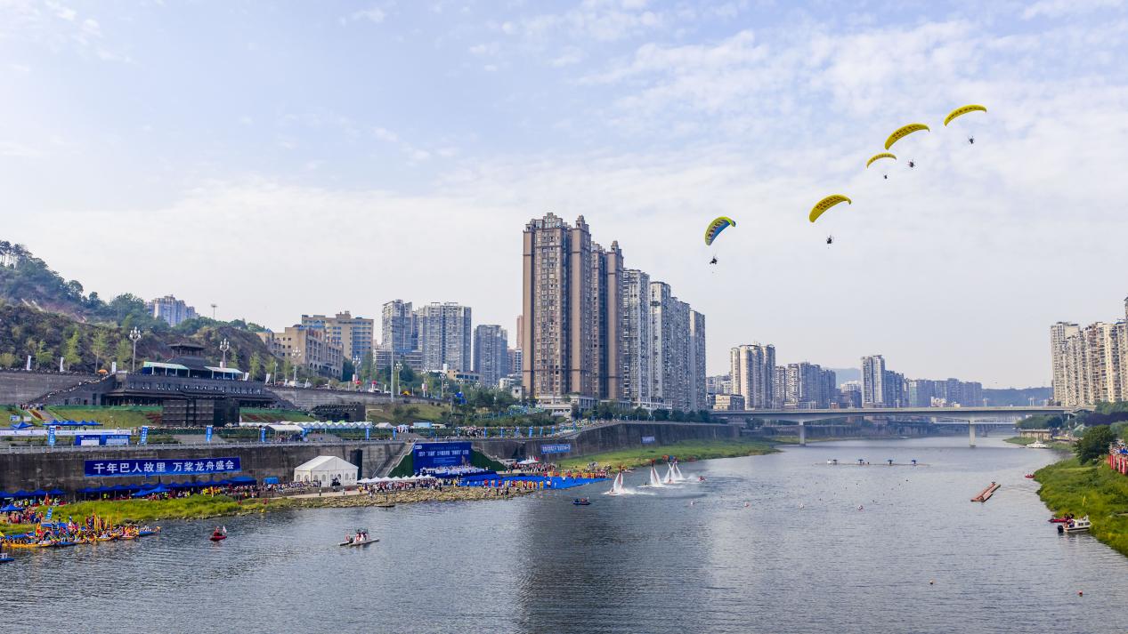 开幕式上,州河河畔彩旗飘扬,动力滑翔伞划过长空,龙舟巡游、点睛仪式等传统环节与“法门武术展演”“安仁板凳龙”等地方特色节目交相辉映,巴文化元素与龙舟精神在此交融。