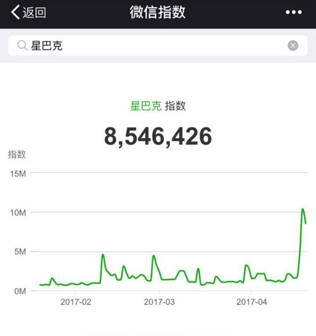 这张是星巴克关键词的在微信上近3月来的热度。作为一个老品牌,这个曲线图上热点的分布,有高有低,而且是连绵的。